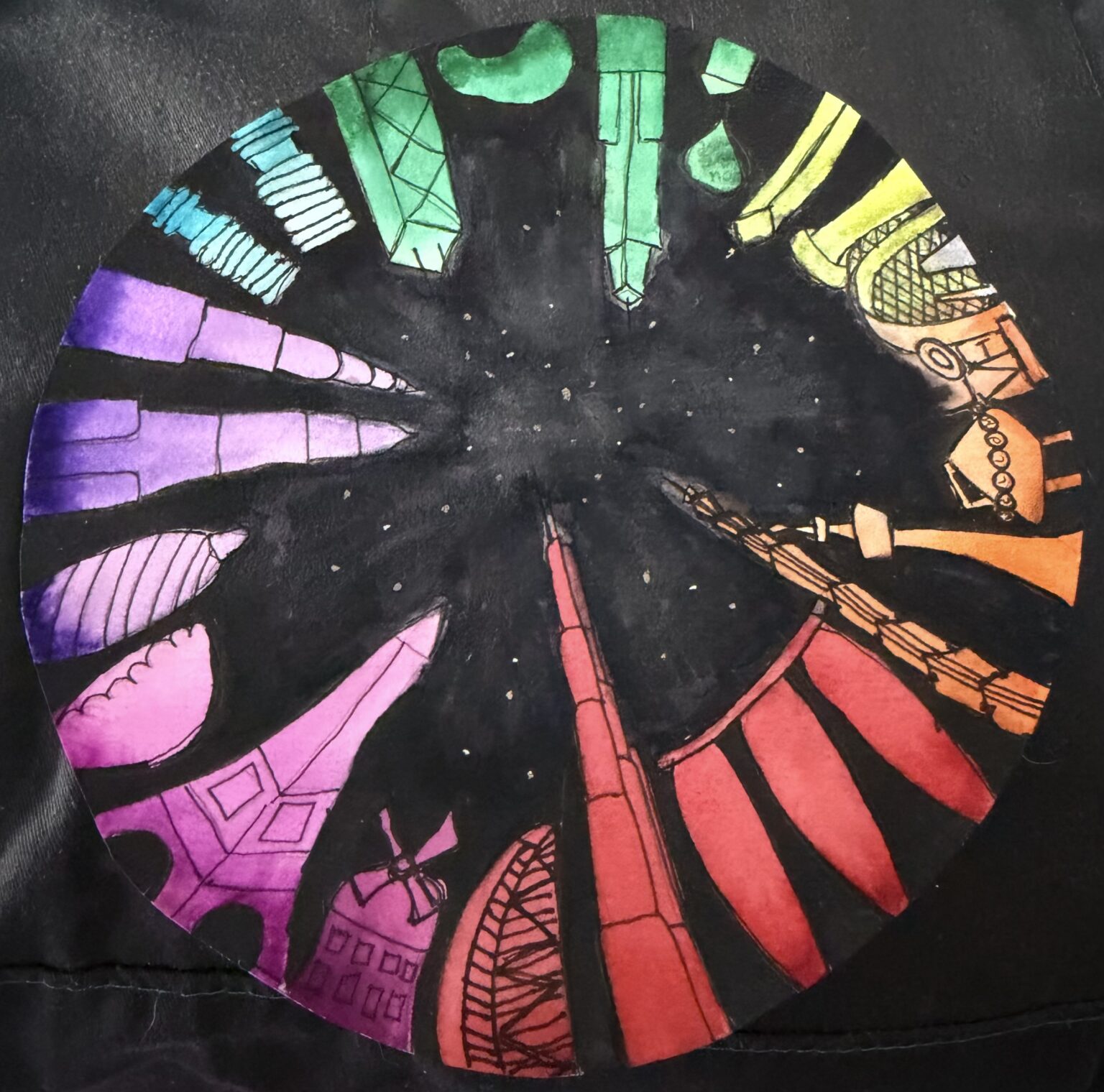 This month at Art & Conversation, we’re flipping the script on perspective. We’ll create a circular cityscape using the color wheel that looks up from the center of the street into a galaxy-filled sky. Think bold buildings radiating outward, sections of vibrant color, and a dreamy universe anchoring it all in the middle. It’s graphic. It’s playful. It looks way more complicated than it actually is. We’ll break it down step by step so you can focus on the fun part, not the “wait, what do I draw?” part.